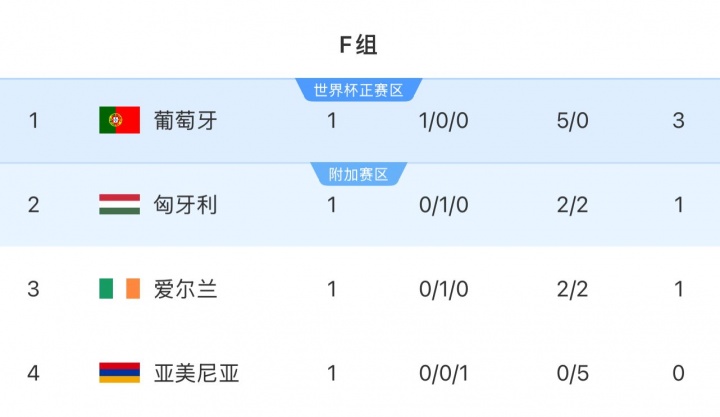 在歐洲預選賽中,F組還剩5場比賽,同一組的葡萄牙對手包括匈牙利,愛爾蘭和亞美尼亞。